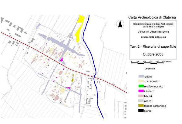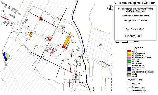 Claterna, dove compare il posizionamento dei singoli scavi.